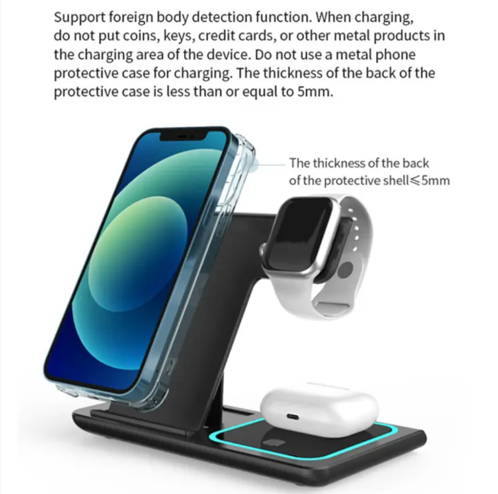 In the current era where smart devices are increasingly popular, the convenience and practicality of charging equipment have become even more crucial. This three-in-one wireless charger, with its advantages such as "charging multiple devices simultaneously, efficient and fast charging, foldable portability, and ambient lighting effect", provides a brand-new solution for charging mobile phones, watches, headphones, and other devices.