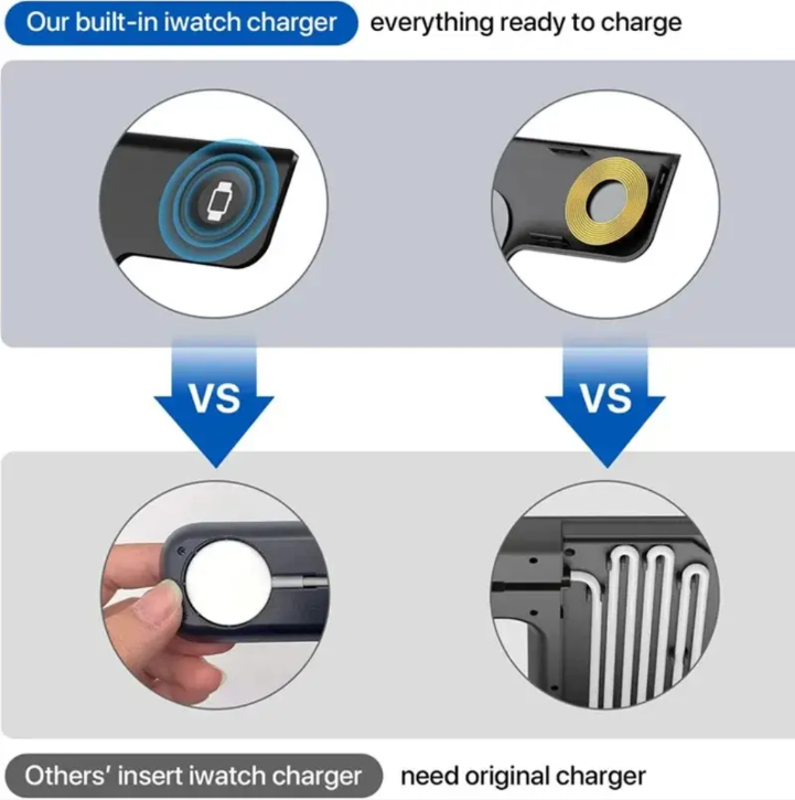 It can wirelessly charge mobile phones, Apple Watches, Bluetooth headphones, and other devices simultaneously, eliminating the need to search for chargers and plug in data cables for each device separately. Whether it's replenishing energy for your phone, watch, and headphones at dawn, or charging multiple devices at the office, you can do it all at once, making charging bid farewell to the cumbersome "queuing" process and significantly improving charging efficiency.