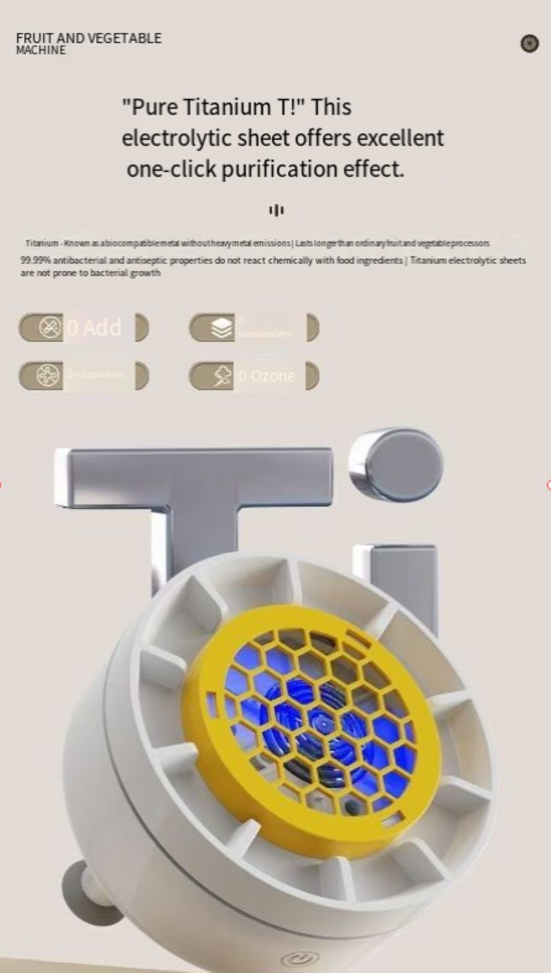 At the heart of this purifier lies the pure titanium Ti electrolytic sheet hydroxyl water ion purification technology. This cutting-edge tech works by electrolyzing water to generate hydroxyl radicals. These radicals are highly reactive and can effectively break down and eliminate a wide range of contaminants. Whether it's pesticide residues on fruits and vegetables, harmful bacteria on meat, or germs on tableware, this technology ensures a deep and thorough clean. And the best part? It achieves all this with 0 additives, guaranteeing a zero - pollution and safe purification process. You can enjoy your food without worrying about any unwanted chemicals.