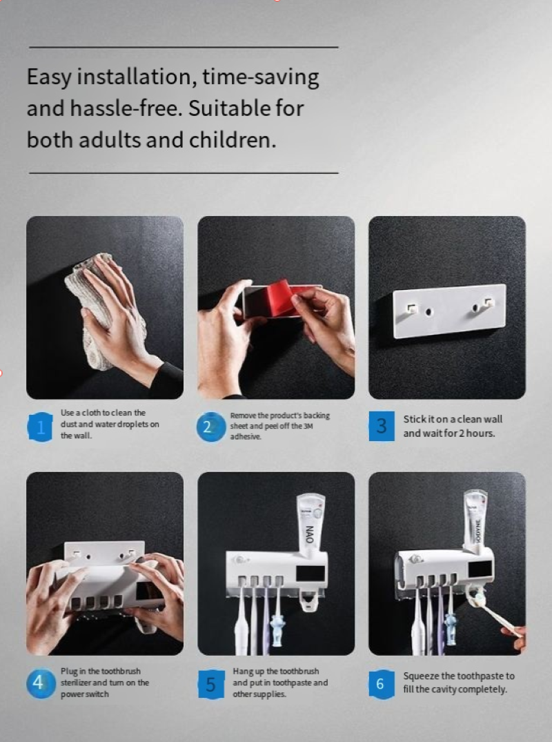 Bathroom space is often at a premium, so we've designed this sanitizer to be wall-mounted. This not only saves valuable counter space but also keeps your toothbrushes elevated and away from potential contaminants on the countertop. The sleek and modern aesthetic of the sanitizer also adds a touch of elegance to your bathroom decor, blending seamlessly with various interior styles.