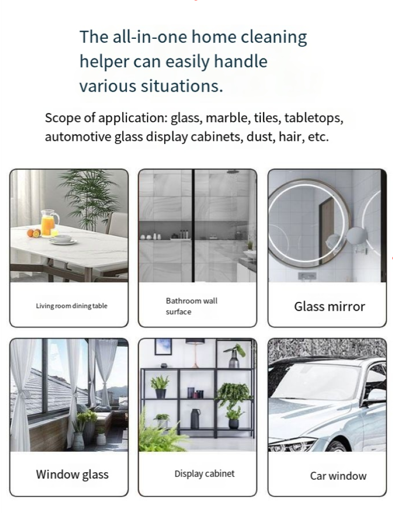 It adopts a dual-effect cleaning system, with one side for powerful scraping and the other for efficient water absorption. Just one operation can make the glass as a mirror. Whether it's stubborn stains, dust, or water marks, they can all be easily removed. The ergonomic handle design ensures a comfortable grip, so your hands won’t get tired even with long-term use. Matched with an adjustable-angle cleaning head, it can flexibly handle various scenarios such as casement windows, sliding windows, and high-rise exterior windows. You no longer need to risk leaning out of the window.