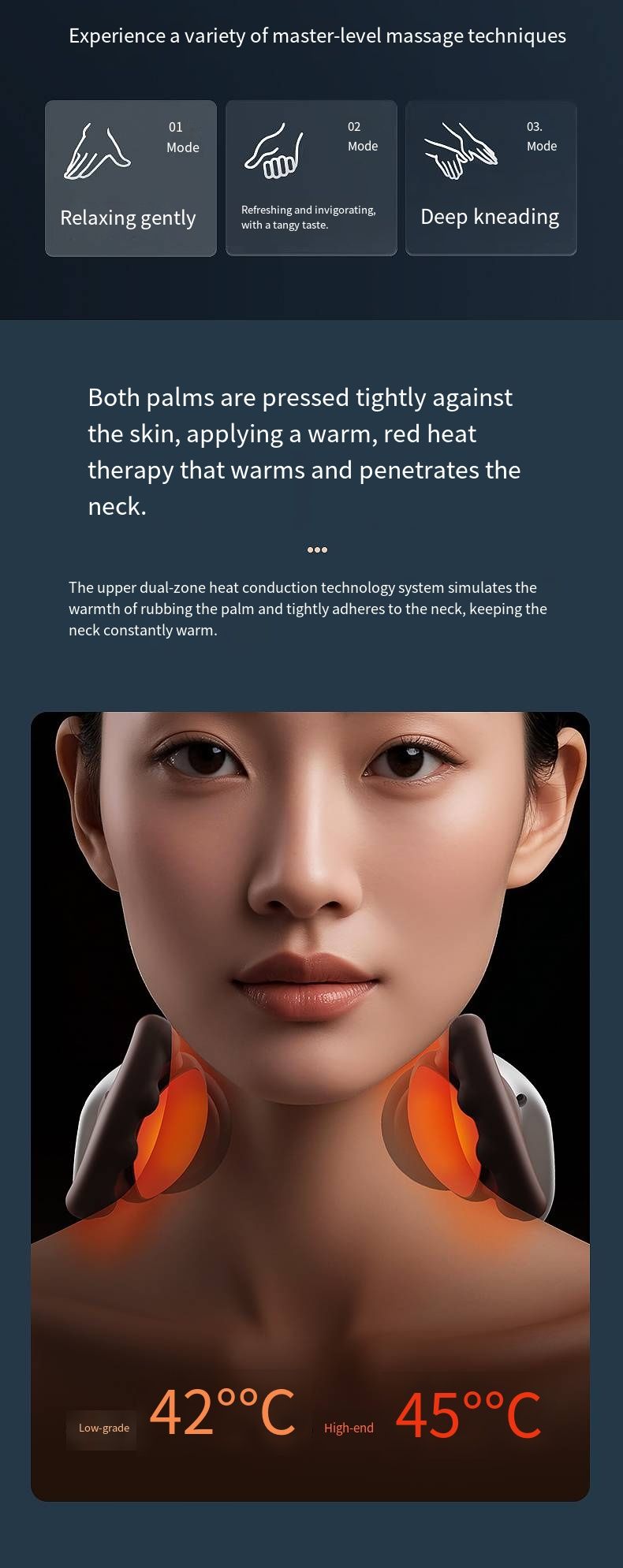 Don't let your shoulders and neck get too stiff! It comes with 3 heat therapy settings, ranging from gentle warming to deep relaxation. Combined with the massage mode, the warm current helps relieve the tension and discomfort, making it super comfortable to use in winter. Enjoy a warm neck SPA right at home!