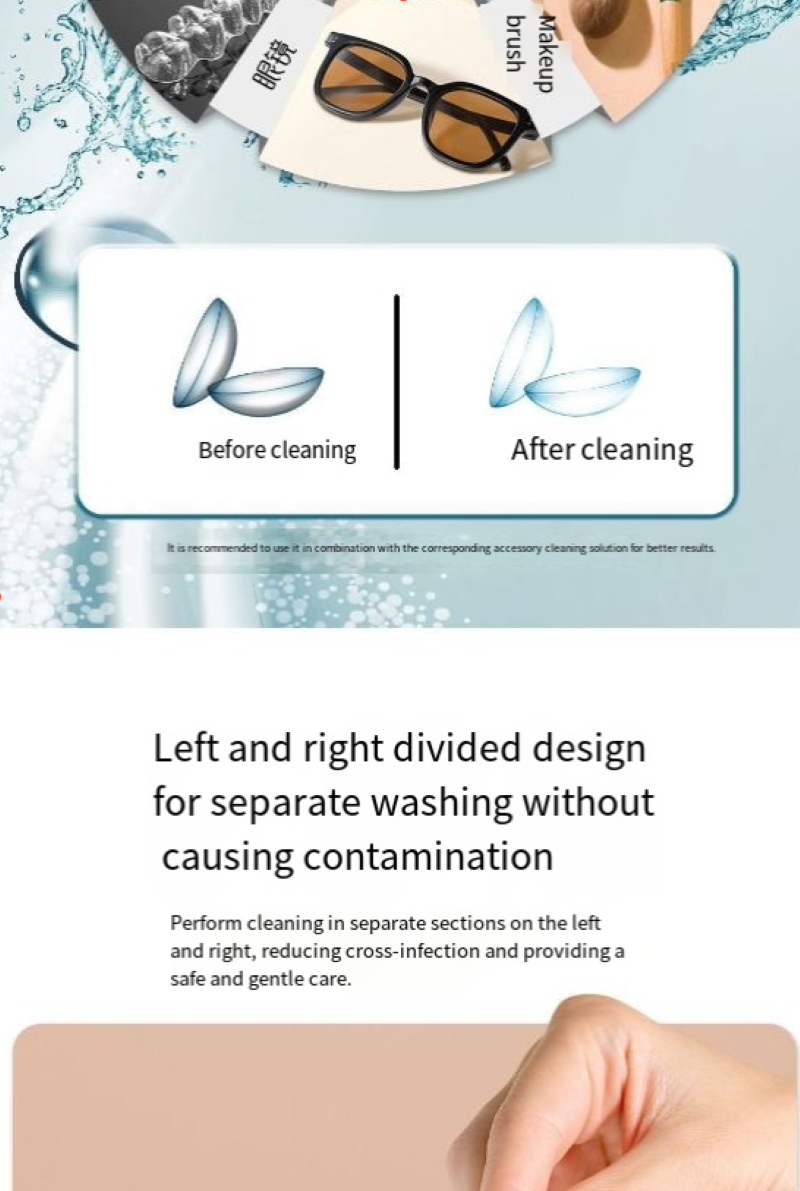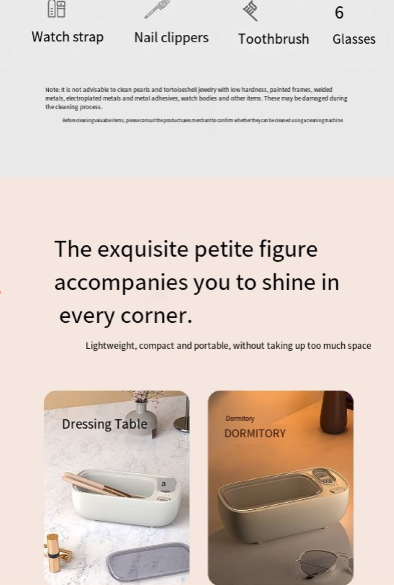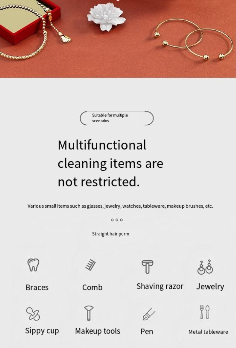 With a compact body and a large-capacity cleaning space, glasses, earrings, watches, razors, makeup brushes... all kinds of small items can be cleaned at will. It's easy to operate, just press to start, making cleaning efficient and worry-free.