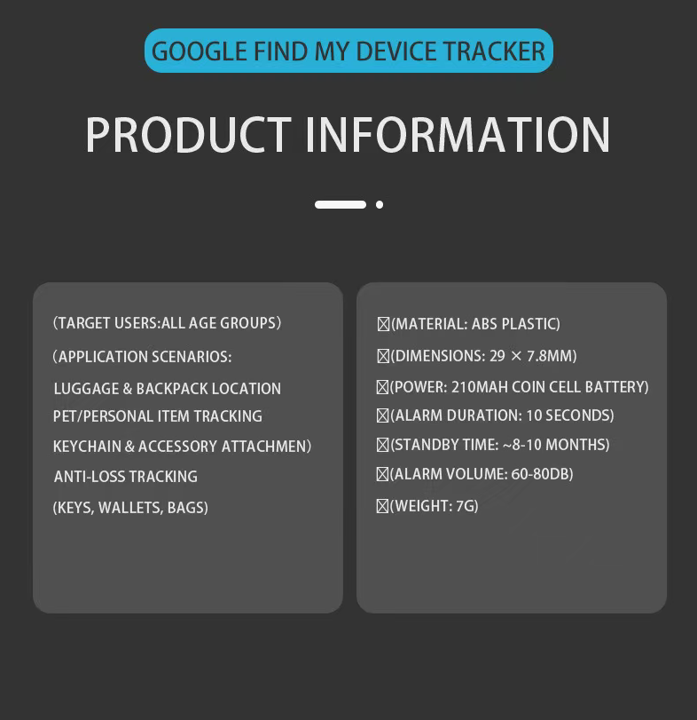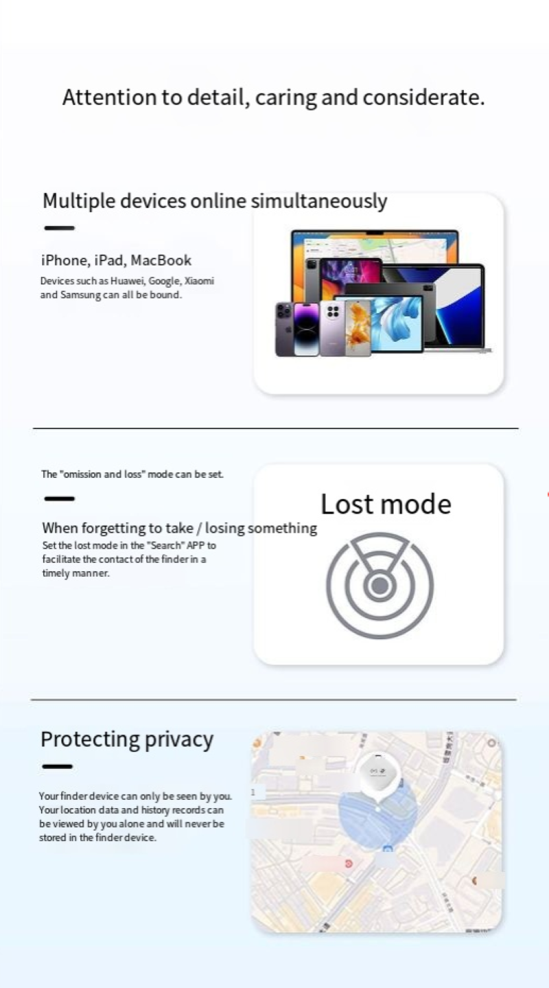 This tracking locator breaks the limitations of devices with multi-system compatibility, enabling users of different systems to use it conveniently; global range-free positioning and high-decibel alerts achieve comprehensive coverage from long-distance tracking to close-range search; intelligent interaction and lost mode further enhance the possibility of item recovery; long-lasting battery life ensures persistent protection capabilities. It is like a loyal guardian, constantly safeguarding your items. Whether it's daily commuting, traveling, or business trips, it can eliminate the anxiety of item loss for you, making you feel more at ease and calm in life and work. It can be said that it is an indispensable anti-loss tool in modern intelligent life, bringing a brand-new guarantee experience for item safety.